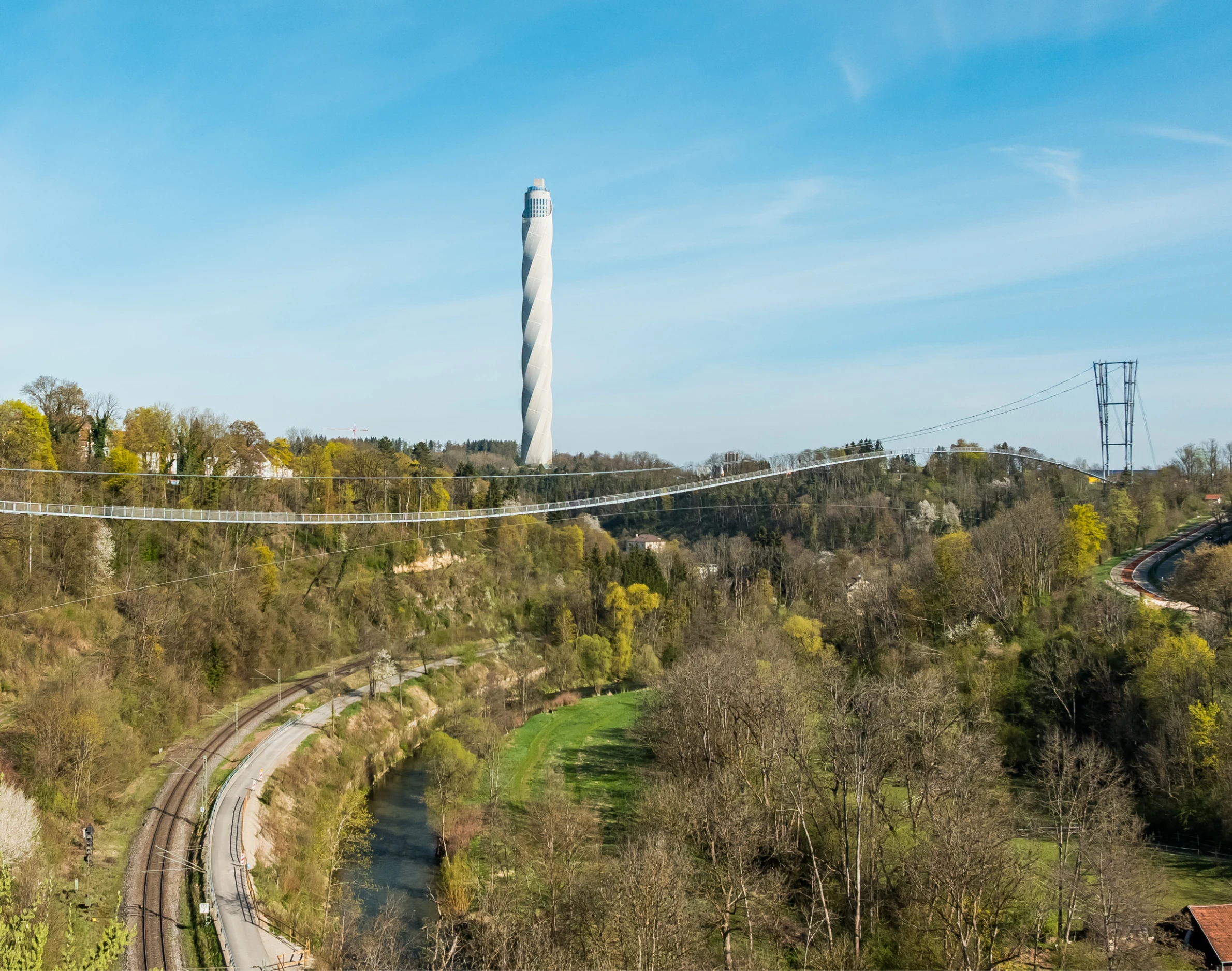 Unterhalb verläuft das Tal des Neckars, eingerahmt von Wäldern und offenen Flächen. Der Fluss zieht sich durch die Landschaft und wird aus der Höhe zu einem ruhigen, fast grafischen Element. Mit zunehmender Distanz zum Einstieg verstärkt sich das Gefühl von Weite. Die Umgebung tritt immer intensiver in den Vordergrund, während die Brücke selbst fast in den Hintergrund rückt. Genau darin liegt der Reiz: Die Konstruktion ermöglicht das Erlebnis, ohne es zu dominieren.